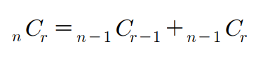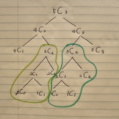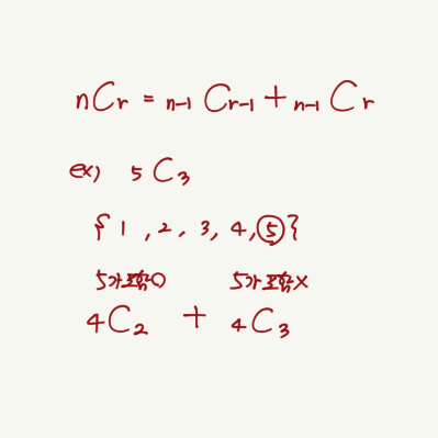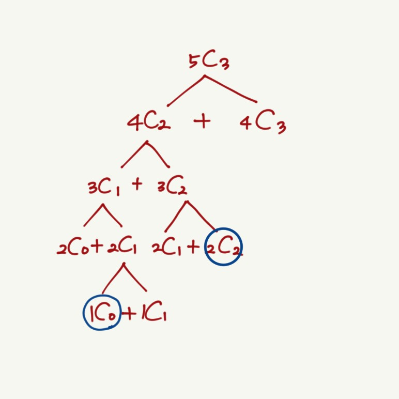 그림과 같이 5개 중에 3개를 뽑는 조합의 수를 구하려고 한다면 맨 마지막 요소인 5를 기준으로 5를 포함해서 3개를 뽑거나 5를 포함하지 않고 3개를 뽑는 경우의 수를 구할 수 있다. 5를 포함한다면 4개 중에 2개를 뽑아야하며 5를 포함하지 않는다면 4개중에 3개를 뽑아야한다. 이 두 경우를 합친 것이 5개 중에 3개를 뽑는 경우의 수가 된다.