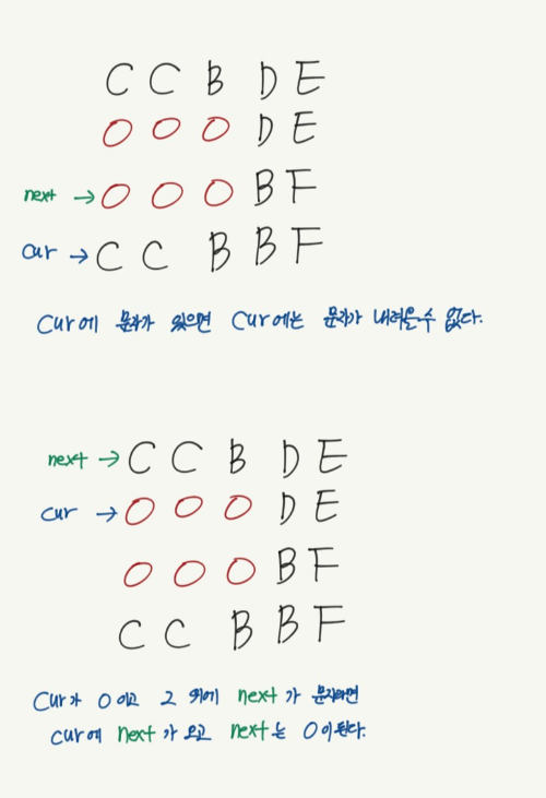 아래에서 위로 탐색하면서 현재 위치에 문자가 떨어져야되는지를 확인해야한다.