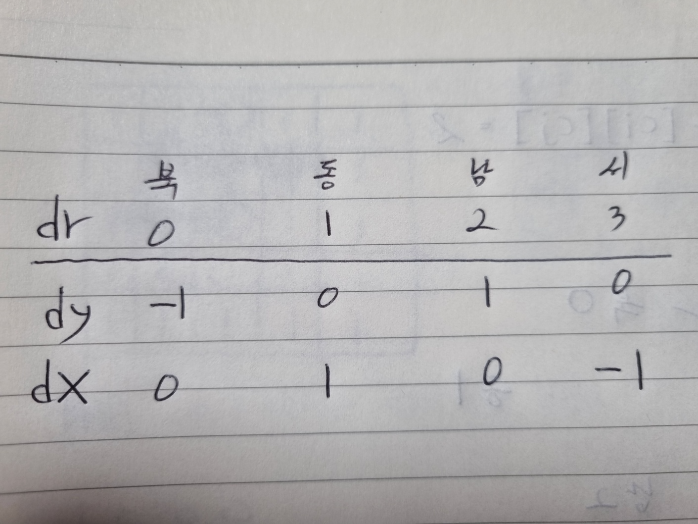 만약 dr이 0이라면 북쪽 방향을 바라보고 있기 때문에 반시계 방향으로 회전시킬 때 3 ➡ 2 ➡ 1 ➡ 0 순번이다.