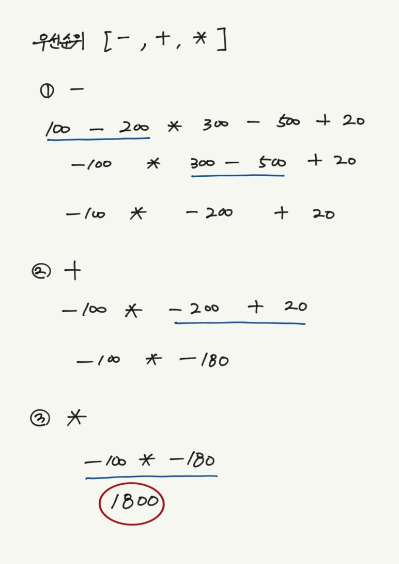 만약 우선 순위가 - > + > * 라면 - 연산부터 모두 하고, 그 다음에 + 연산, 그 다음에 * 연산을 이어서 해주면 된다.