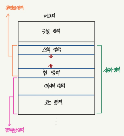 반면에 힙 영역과 스택 영역은 실시간으로 그 크기가 변할 수 있기 때문에 동적 할당 영역이라고 부른다.