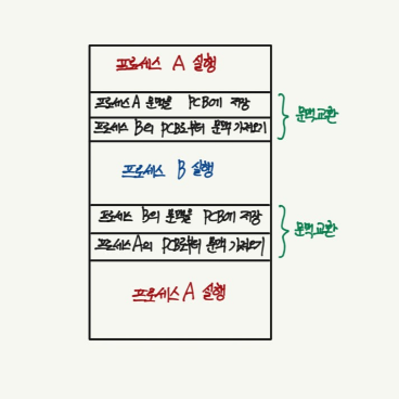 하나의 프로세스 수행을 재개하기 위해 기억해야할 정보를 문맥이라고 한다. 그리고 하나의 프로세스 문맥은 해당 프로세스의 PCB에 표현되어있다.