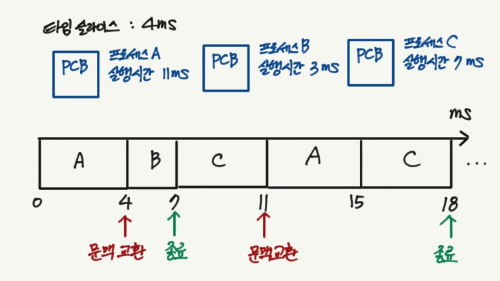 정해진 시간을 모두 사용했음에도 아직 프로세스를 완료하지 못했다면 다시 큐의 맨 뒤에 삽입된다. 이때 문맥교환이 발생한다.