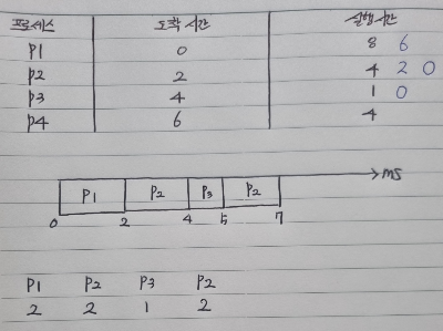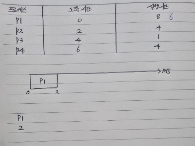 그 다음 도착하는 프로세스는 P2인데 도착시간이 2이다. 따라서 P1은 2초동안 실행되고 남은 실행시간은 6초가 된다.