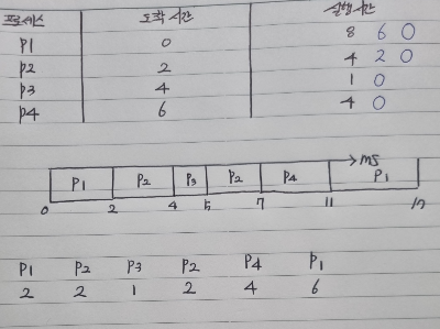 즉, 정해진 타임 슬라이스만큼의 시간 동안 돌아가며 CPU를 이용하는 선점형 스케줄링이다.