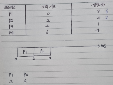 왜냐하면 2초시점에서 P1은 실행시간이 6초 남았고, P2는 4초 남았기 때문이다.
