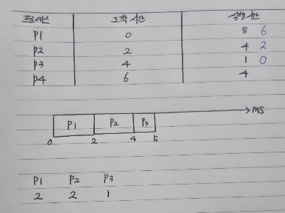 그리고 다음번에 들어오는 프로세스는 P3이고 4초에 들어오기 때문에 P2를 2초에서 4초동안 수행하고 남은 실행시간은 2초가 된다.