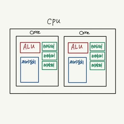 - 코어 : 명령어를 실행할 수 있는 하드웨어 부품
