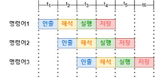 현재 t3 지점에서 명령어1을 실행하면서 명령어2는 해석하고 있으며 명령어3은 인출하고 있다.