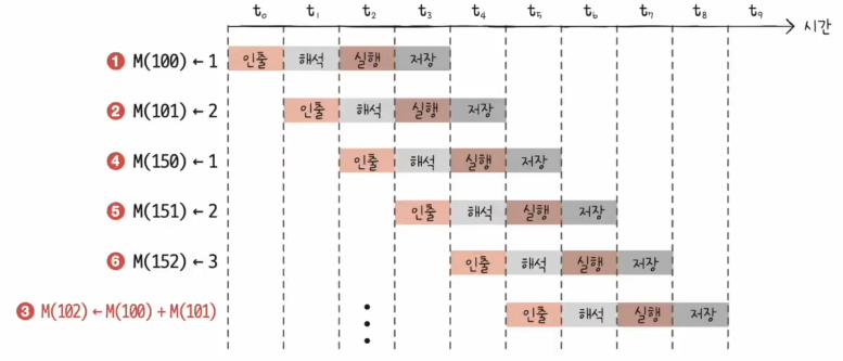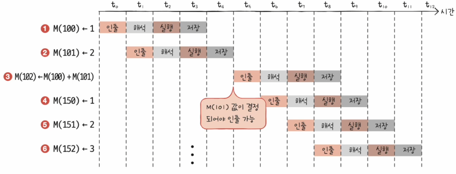 이처럼 파이프라인의 중단을 방지하기 위해 명령어를 순차적으로 처리하지 않는 명령어 병렬 처리 기법을 비순차적 명령어 처리 기법이라고 한다.
