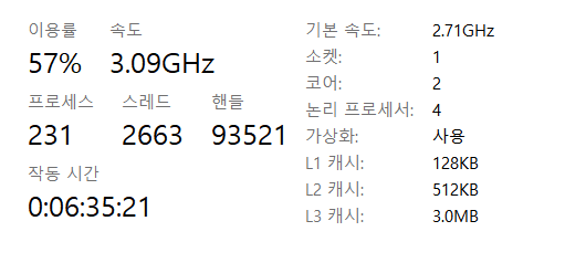아래 그림에서 논리 프로세서는 4이다. 실제 명령어를 처리하는 부품(코어)은 2개이지만 프로그램 입장에서는 한 번에 하나의 명령어를 처리하는 부품이 4개 있는 것처럼 보인다는 뜻이다.