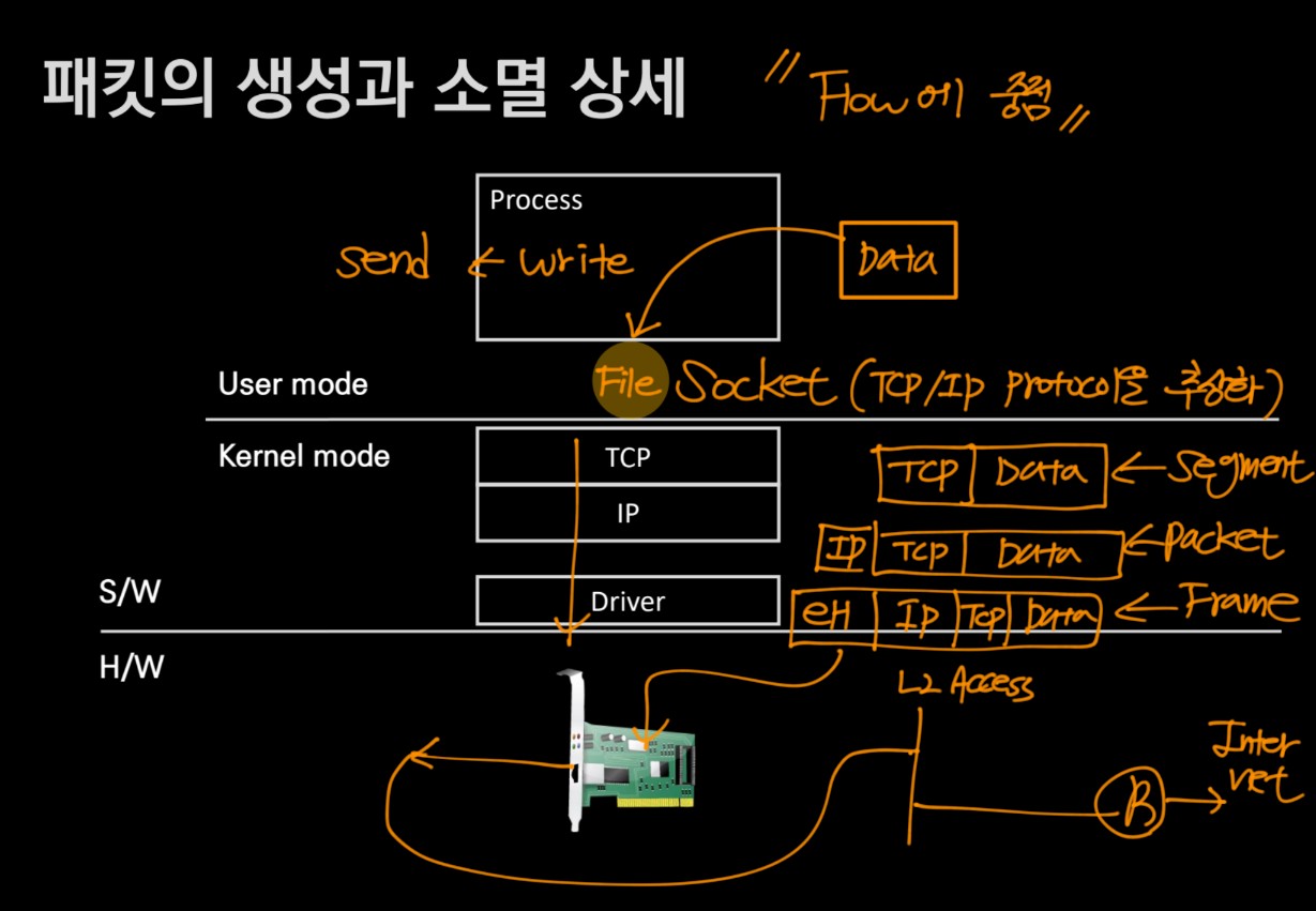 강의에서도 반복적으로 다루는 그림이다. 네트워크 플로우를 운영체제의 구조와 함께 익히는 것이 매우 중요하다.