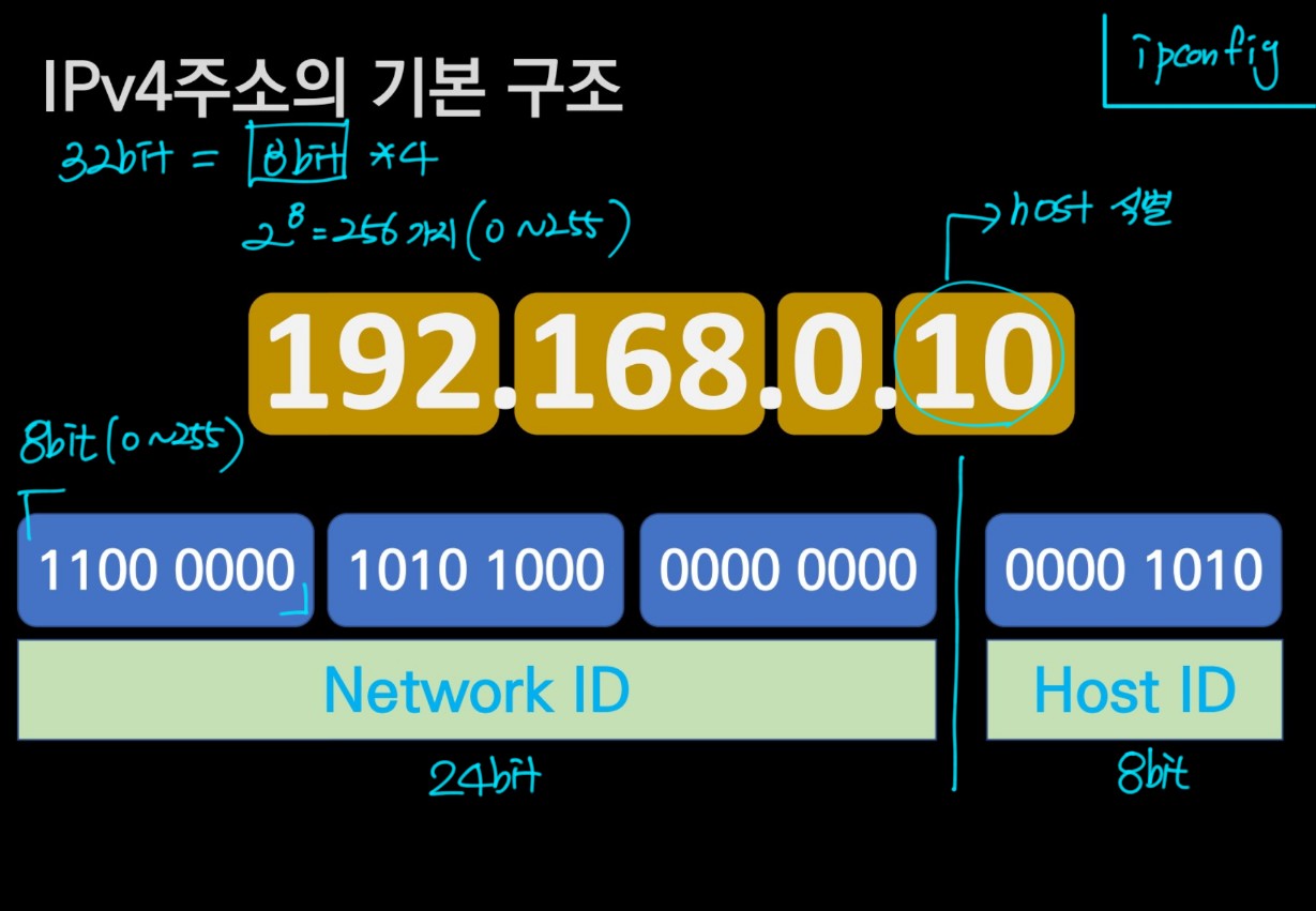 중요한 것은 IPv4주소가 Network ID와 Host ID로 구분된다는 것이다. 맨 뒤 8bit는 Host ID에 해당하며 호스트를 식별하는데 사용된다. 비유하면 강남구 역삼동 82번지라는 주소가 있을 때, 강남구 역삼동에 해당하는 것이 Network ID이고 세부적인 번지가 바로 Host ID이다.
