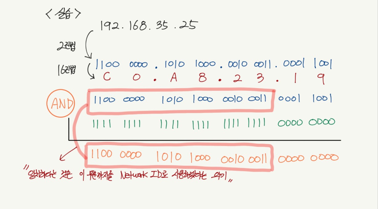 IP주소와 서브넷 마스크를 2진법으로 표기하면 아래 그림과 같다.