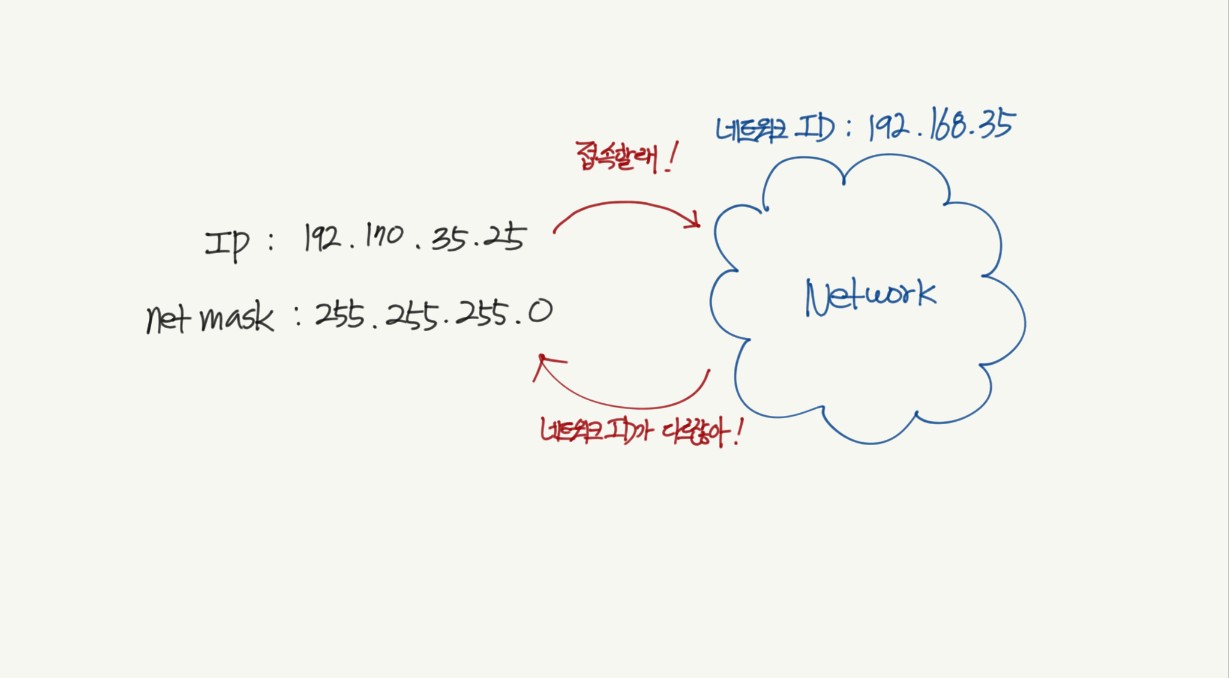 네트워크의 접속과정을 단순하게 표현해보자. IP주소를 가지고 네트워크에 접속하려고 하면 해당 네트워크에서 같은 네트워크ID인지 확인한다. 그런데 달랑 IP주소만 가지고 가면 IP주소 중 어디까지가 네트워크ID인지를 확인할 수 없다.
