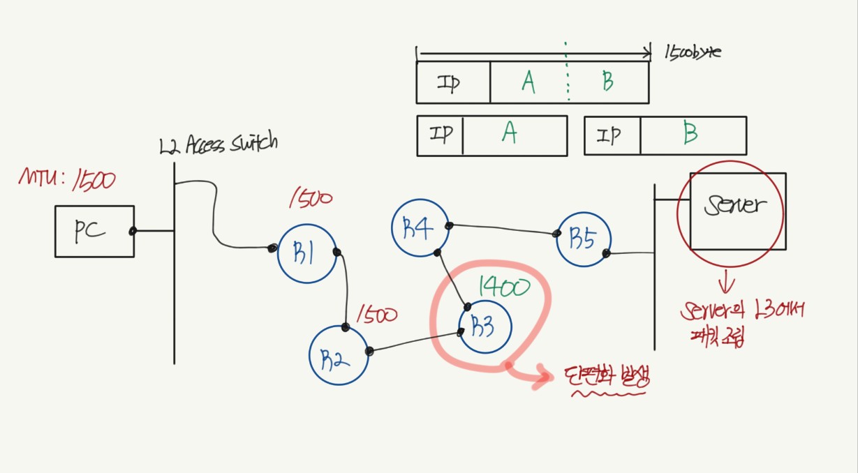 위의 그림처럼 R3라우터에서 MTU가 1400bytes로 줄었기 때문에 기존 패킷의 크기였던 1500bytes를 줄여야한다.