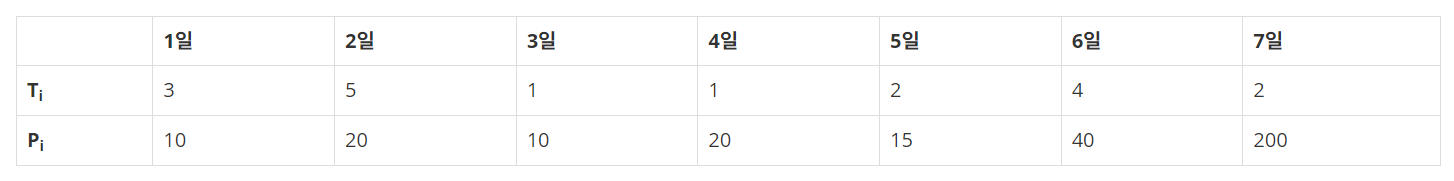 각각의 상담은 상담을 완료하는데 걸리는 기간 Ti와 상담을 했을 때 받을 수 있는 금액 Pi로 이루어져 있다.