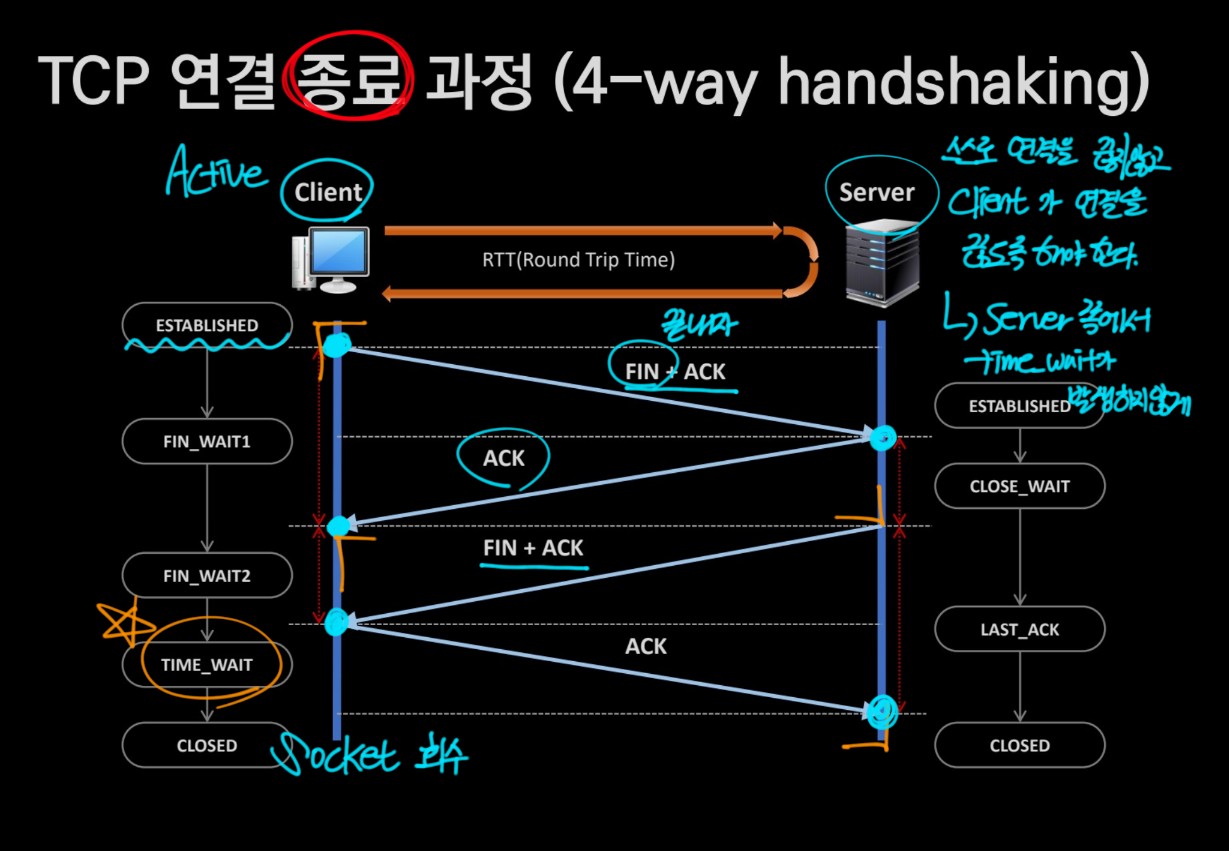TCP Connection의 종료는 4-way handshaking을 거친다. 연결 종료는 서로 연결이 성립된 상태에서 시작한다.