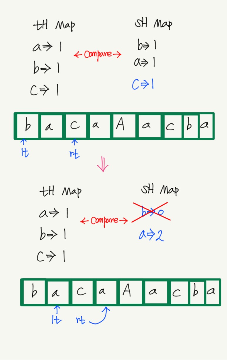 해쉬맵끼리 비교를 했으면 슬라이딩 윈도우를 옆으로 밀어야한다.
