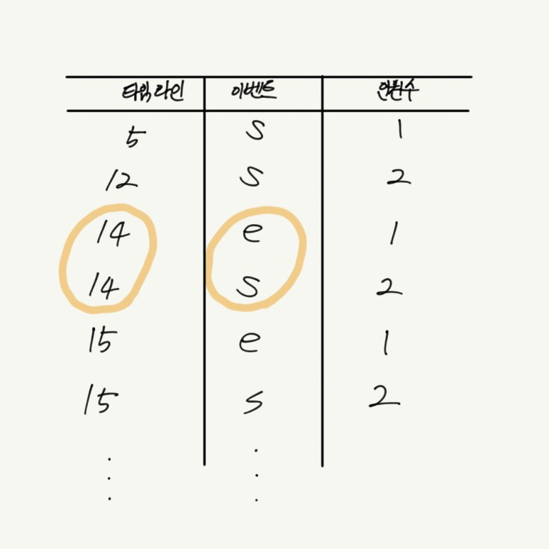 그 특정 시간 즉, 누군가 오거나 가는 이벤트가 발생하는 시점에 인원이 몇 명 있는지를 각각 구해 최댓값을 구하면 되는 것이다.