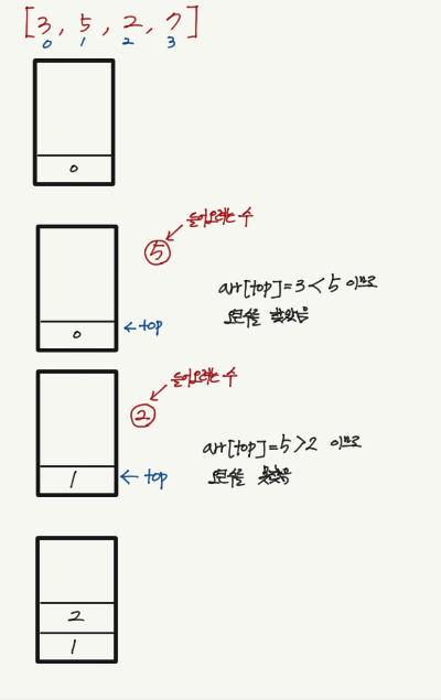 5를 오큰수로 갖는 값은 3이다. 2를 오큰수로 갖는 값도 없다. 7을 오큰수로 갖는 값은 5와 2이다.