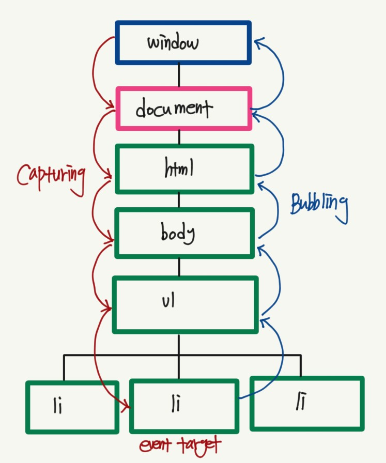 정리하면 이벤트 전파는 캡쳐링 ➡ 타겟 ➡ 버블링의 과정을 거친다.