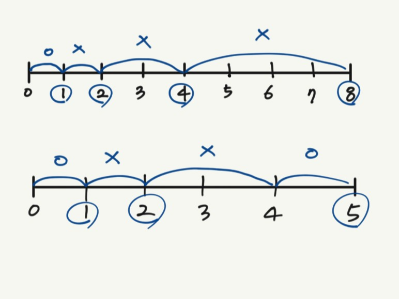 그리고 배터리 갯수를 누적하면 된다. D(1)에서 1이 리턴되고 D(2)는 2까지 가는데 필요한 배터리의 갯수인데 처음 소모한 배터리를 제외하고 배터리를 소모하지 않는다. 따라서 그대로 1이 리턴되고 D(4)도 처음 소모한 배터리를 제외하고 배터리를 소모하지 않으므로 그대로 1이 리턴되고 D(8)도 마찬가지이므로 총 배터리의 갯수는 1이 된다.