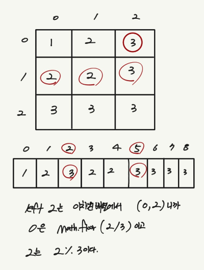 1차원 배열에서의 위치를 2차원 배열에서의 좌표로 변환하는 과정 을 배웠다. 나중에 유사한 문제가 나왔을 때 까먹지 않도록 복습해야겠다.