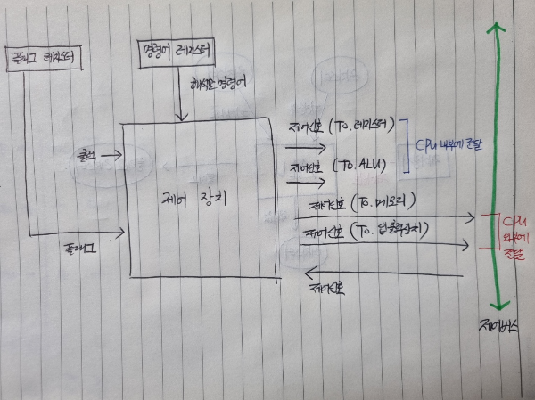 제어장치는 제어 신호를 내보내고, 명령어를 해석하는 부품이다. 그리고 제어 신호는 컴퓨터 부품을 관리하고 작동시키기 위한 일종의 전기 신호이다.